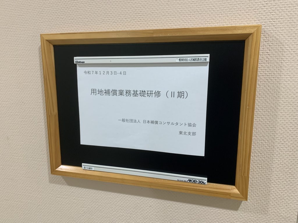 令和7年12月3日(水)・4日(木)の2日間にかけて、宮城県仙台市のフォレスト仙台にて行われました、(一社)日本補償コンサルタント協会 東北支部主催の「用地補償業務基礎研修(Ⅱ期)」において、弊社から2名が受講、1名が講師として参加いたしました。